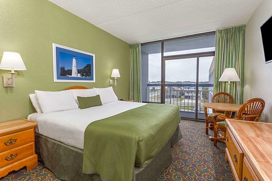 This accessible room features a pool view, flat-screen cable TV, and free WiFi. The bathroom has a raised toilet and hand rails.